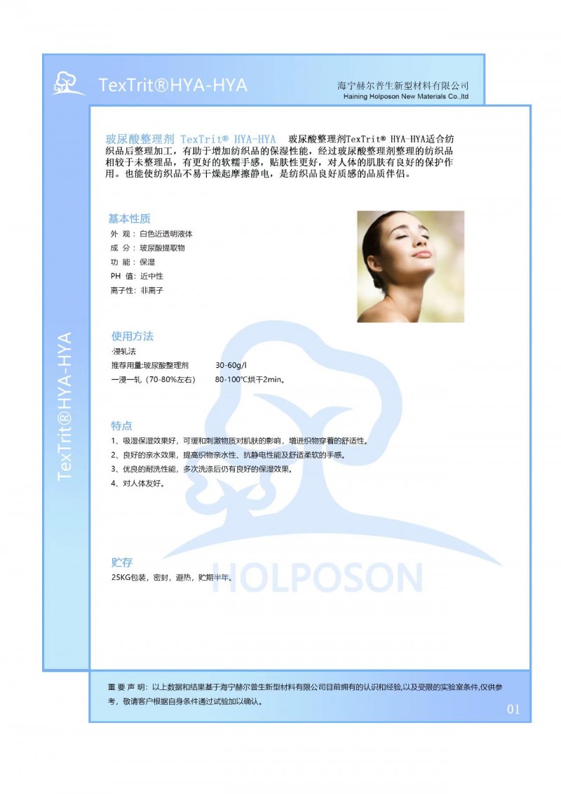 玻尿酸整理劑HOLPOSON? HYA-HYA適合紡織品后整理加工,有助于增加紡織品的保濕性能,經過玻尿酸整理劑整理的紡織品相較于未整理品,有更好的軟糯手感,貼膚性更好,對人體的肌膚有良好的保護作用。也能使紡織品不易干燥起摩擦靜電,是紡織品良好質感的品質伴侶。