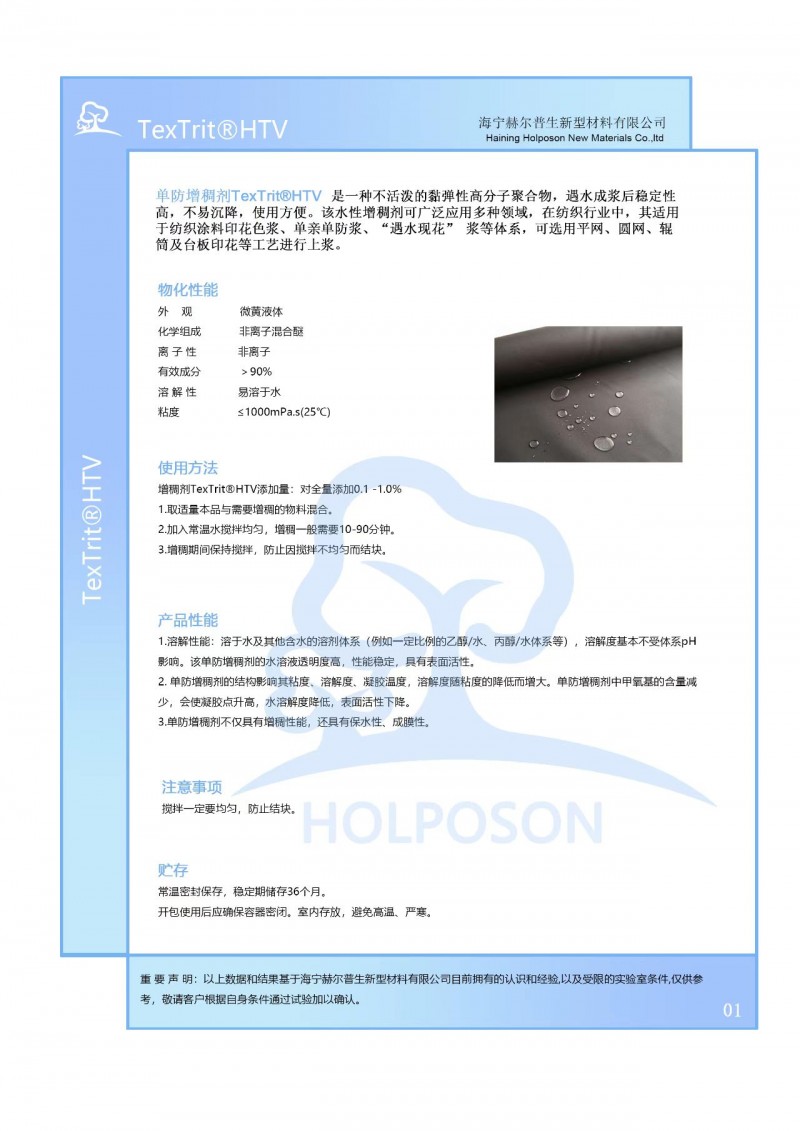 單防增稠劑HOLPOSON?HTV是一種不活潑的黏彈性高分子聚合物,遇水成漿后穩定性高,不易沉降,使用方便。該水性增稠劑可廣泛應用多種領域,在紡織行業中,其適用于紡織涂料印花色漿、單親單防漿、“遇水現花” 漿等體系,可選用平網、圓網、輥筒及臺板印花等工藝進行上漿。