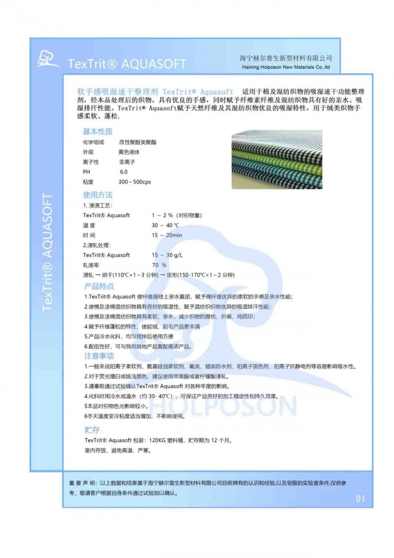 HOLPOSON? Aquasoft適用于棉及混紡織物的吸濕速干功能整理劑,經(jīng)本品處理后的織物,具有優(yōu)良的手感,同時賦予纖維素纖維及混紡織物具有良好的親水、吸濕排汗性能。HOLPOSON? Aquasoft賦予天然纖維及其混紡織物優(yōu)良的吸濕特性,用于絨類織物手感柔軟、蓬松.