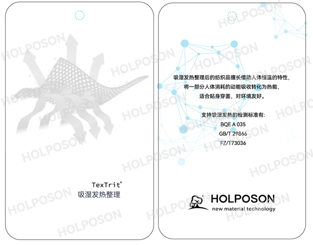 HOLPOSON? HOT適合用于棉,粘膠,滌綸,晴綸等各種纖維的后整理。其作用原理 HOLPOSON? HOT 是處理在面料上,使面料周圍的水蒸氣或者汗蒸汽凝聚成水珠或者汗珠所產出的凝聚熱,讓人體感受到暖感,從而達到蓄熱保暖的功能。
