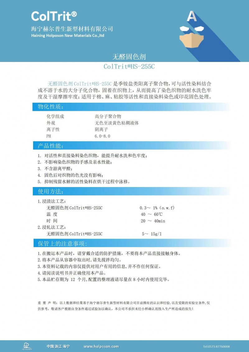 無醛固色劑ColTrit? HS-255C是季銨鹽類陽離子聚合物,可與活性染料結合成不溶于水的大分子化合物,固著在織物上,從而提高了染色織物的耐水洗色牢度及干濕摩擦牢度;適用于棉、麻、粘膠等活性和直接染料染色或印花固色處理。