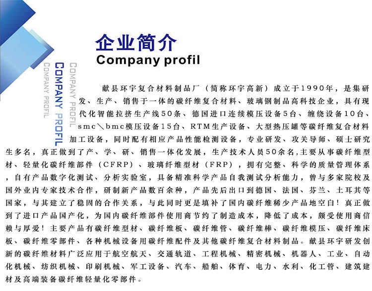 公司簡介   獻縣環宇復合材料制品廠(簡稱環宇高新)成立于1990年,是集研發、生產、銷售于一體的碳纖維復合材料、玻璃鋼制品高科技企業,具有現代化智能擠拉生產線50條、德國進口連續模壓設備5臺、纏繞設備10臺、smc\bmc模壓設備15臺、RTM生產設備、大型熱壓罐等碳纖維復合材料加工設備,同時配有相應產品性能檢測設備,專業研發、攻關導師、碩士研究生多名,真正做到了產、學、研、銷售一體化發展,生產技術人員50余名,主要從事碳纖維型材、輕量化碳纖維部件(CFRP)、玻璃纖維型材(FRP),擁有完整、科學的質量管理體系,自有產品數字化測試、分析實驗室,具備精準科學產品自我測試分析能...