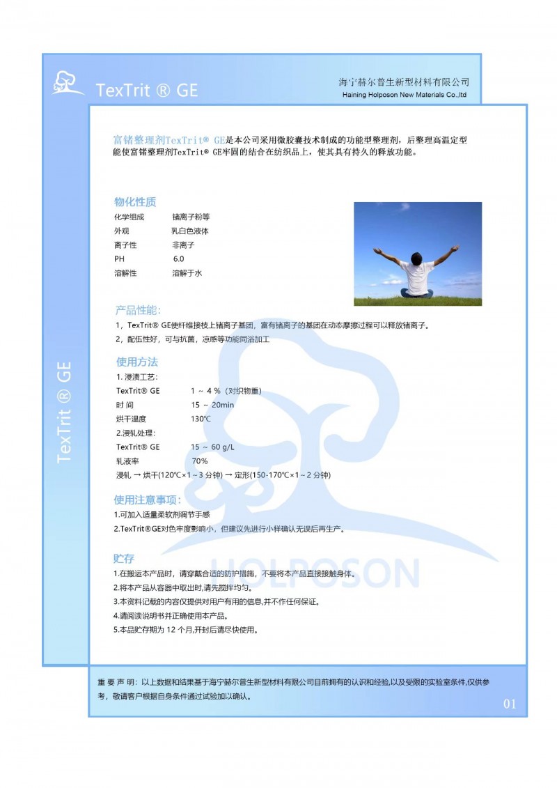 富鍺整理劑HOLPOSON? GE是本公司采用微膠囊技術(shù)制成的功能型整理劑,后整理高溫定型能使富鍺整理劑HOLPOSON? GE牢固的結(jié)合在紡織品上,使其具有持久的釋放功能。