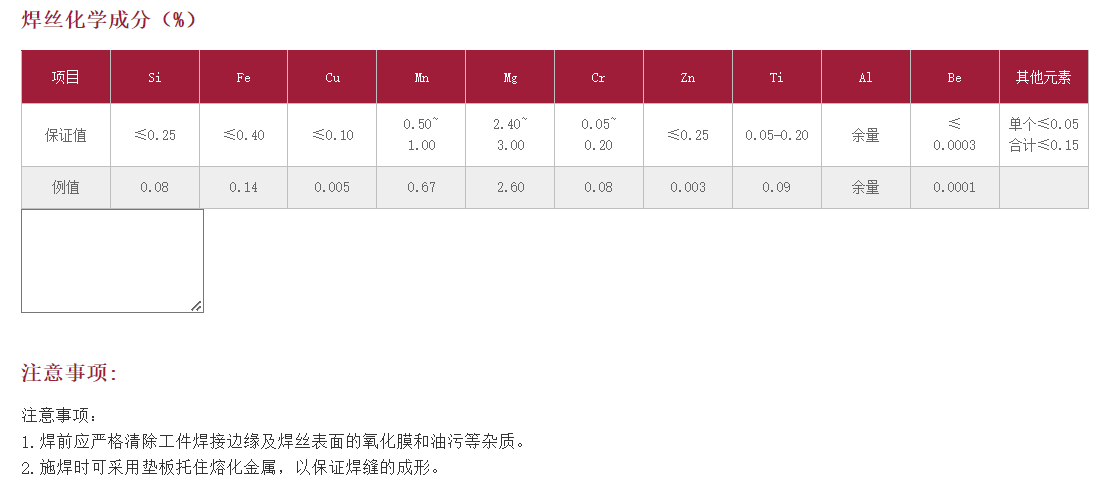 符合 符合 GB/T 10858 SAl 5554AWS A5.10 ER5554/R5554EN ISO 18273-S Al 5554 說明: JQ?SAl 5554 是含2.7%鎂的鋁合金焊絲;焊接工藝性能優良,電弧穩定、飛濺小,焊縫成形美觀光亮。焊絲特點: 1.具有良好的加工性能,抗腐蝕性和陽極氧化顏色配比性; 2.良好匹配5454鋁合金化學特性,獲得優良的抗腐蝕性能; 3.焊縫金屬在高溫條件下不易發生應力腐蝕開裂。 用途: 適用于化學品儲罐、汽車輪轂、公路拖車、鐵路集裝箱等鋁合金部件的焊接。