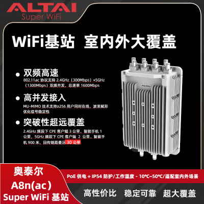 奧泰爾 A8n (ac) Super WiFi 基站是奧泰爾科技推出的新一代室外型 WiFi 基站 / AP,采用一體化設(shè)計(jì),支持 802.11ac 技術(shù),是 A8n 基站的升級(jí)版本(5GHz 射頻模塊從 802.11a/n 升級(jí)至 802.11a/n/ac)。作為 Super WiFi 網(wǎng)絡(luò)架構(gòu)的核心設(shè)備,其集成多波束天線陣列,以*少的站基數(shù)量實(shí)現(xiàn)*大化覆蓋范圍與用戶容量,專為遠(yuǎn)距離扇區(qū)覆蓋、復(fù)雜環(huán)境下的無線寬帶接入及移動(dòng)數(shù)據(jù)分流場景設(shè)計(jì),為運(yùn)營商和企業(yè)提供高性價(jià)比的無線網(wǎng)絡(luò)解決方案。