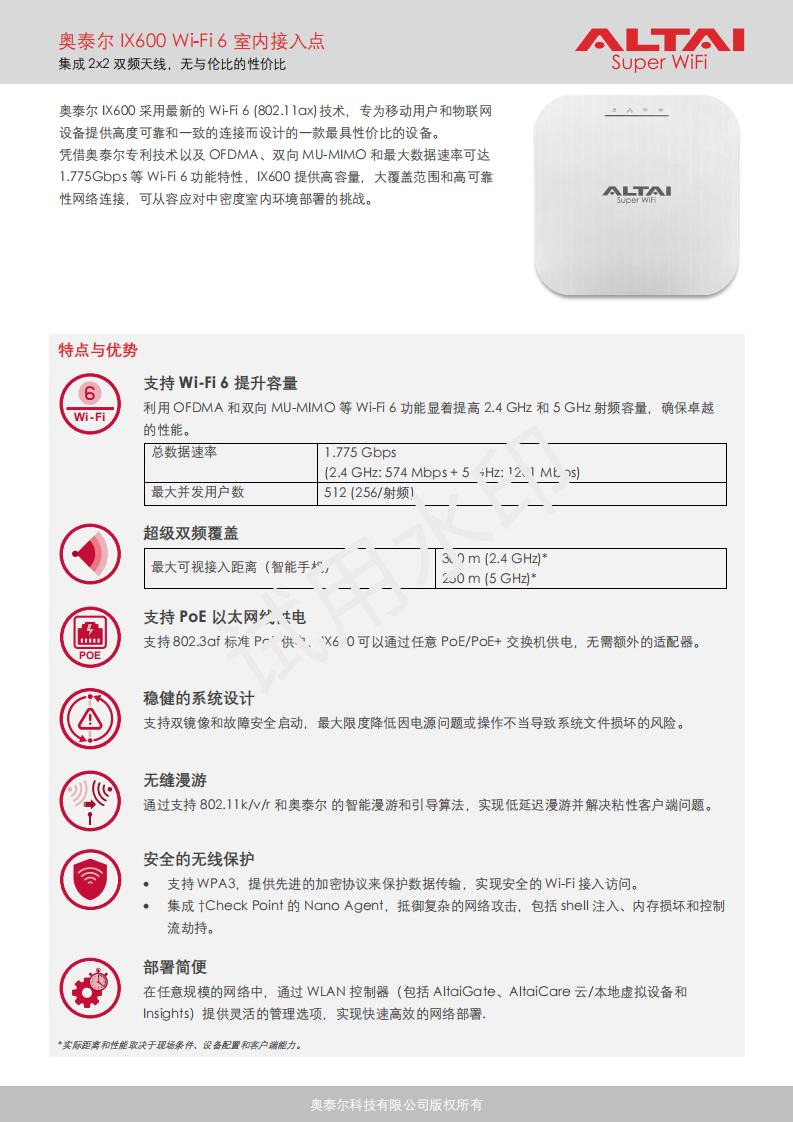 • 奧泰爾 IX600 室內 Wi-Fi 6 接入點 | 雙頻 1.775Gbps