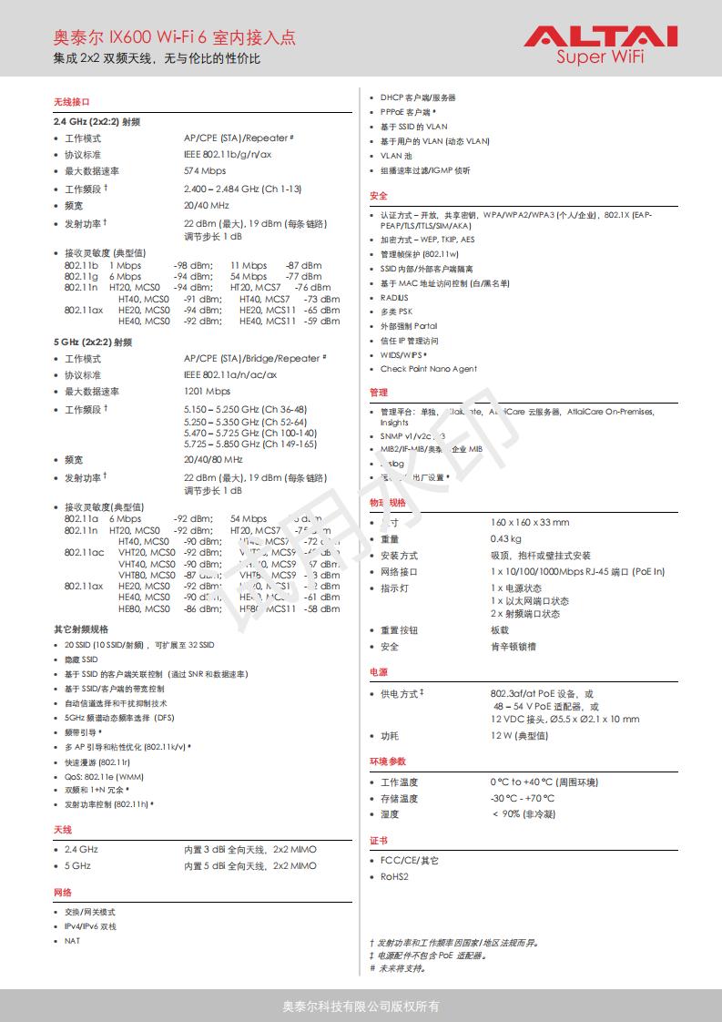 無線接口- 2.4GHz:802.11b/g/n/ax(2x2:2 MIMO),頻率 2.400–2.484GHz,發射功率*大 22dBm,接收靈敏度 1Mbps -98dBm