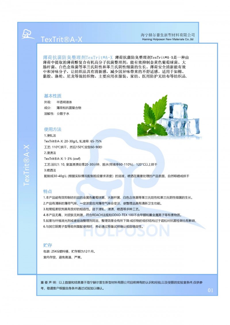 薄荷抗菌防臭整理劑HOLPOSON?A-X是一種由薄荷中提取的薄荷醇復(fù)合有機(jī)高分子抗菌整理劑,能有效抑制金黃色葡萄球菌、大腸桿菌、白色念珠菌等革蘭氏陽性和革蘭氏陰性細(xì)菌的生長。薄荷安全清新能有效中和異味分子,讓紡織品具有清新感,減少因異味帶來的不舒適感。適用于如棉、黏膠、滌綸、尼龍等混紡織物。主要應(yīng)用在服裝、家紡、防護(hù)無紡布等紡織品.